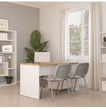 Esta mesa de estudio combina elegancia y funcionalidad, ideal para cualquier espacio de trabajo o estudio que busque un diseño limpio y acogedor. La encimera y estructura están fabricadas en MDF lacado con un elegante acabado en blanco mate, mientras que las patas y cajones, hechos en madera de pino maciza, añaden un toque natural y cálido que realza el estilo del mueble.